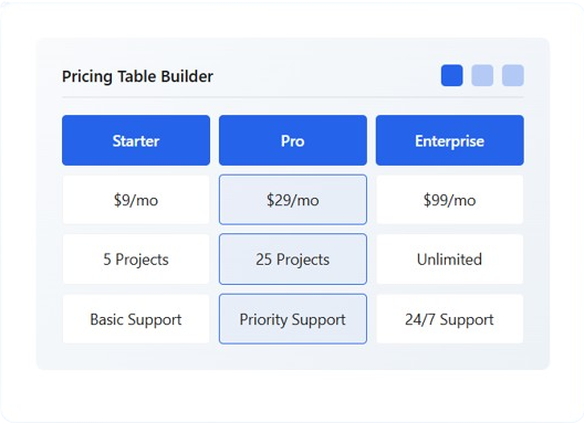 Create stunning pricing tables without writing a single line of code. Our intuitive visual editor makes it easy to design, customize, and perfect your pricing presentation.